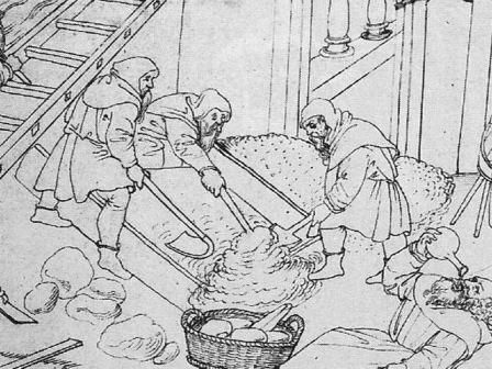 Hilfsarbeiter beim Kalklöschen und bei der Mörtelherstellung mit Mischhacke und Rührspaten.